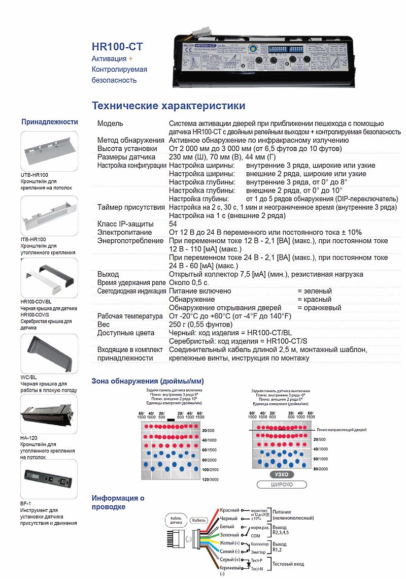 Интеллектуальная однонаправленная способность обнаружения уменьшает удержание дверей в открытом положении на 20% времени, что дает сокращение потери энергии в задании на 6% при стандартном монтаже датчика. HOTRON HR100-CT позволяет гибко отрегулировать зону обнаружения для активации дверей
